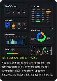 A centralized dashboard displays live statistics, player metrics, and team performance data, helping teams monitor progress instantly.
