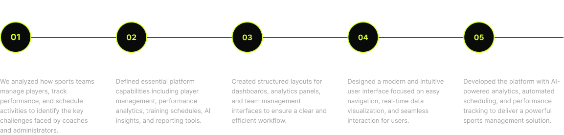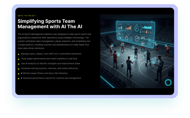 To solve the challenges of manual team management and limited performance insights, we developed an AI-powered sports management platform that centralizes team operations, player analytics, and scheduling in one intelligent system. The platform enables coaches, analysts, and administrators to make faster decisions using real-time data and AI-driven insights.