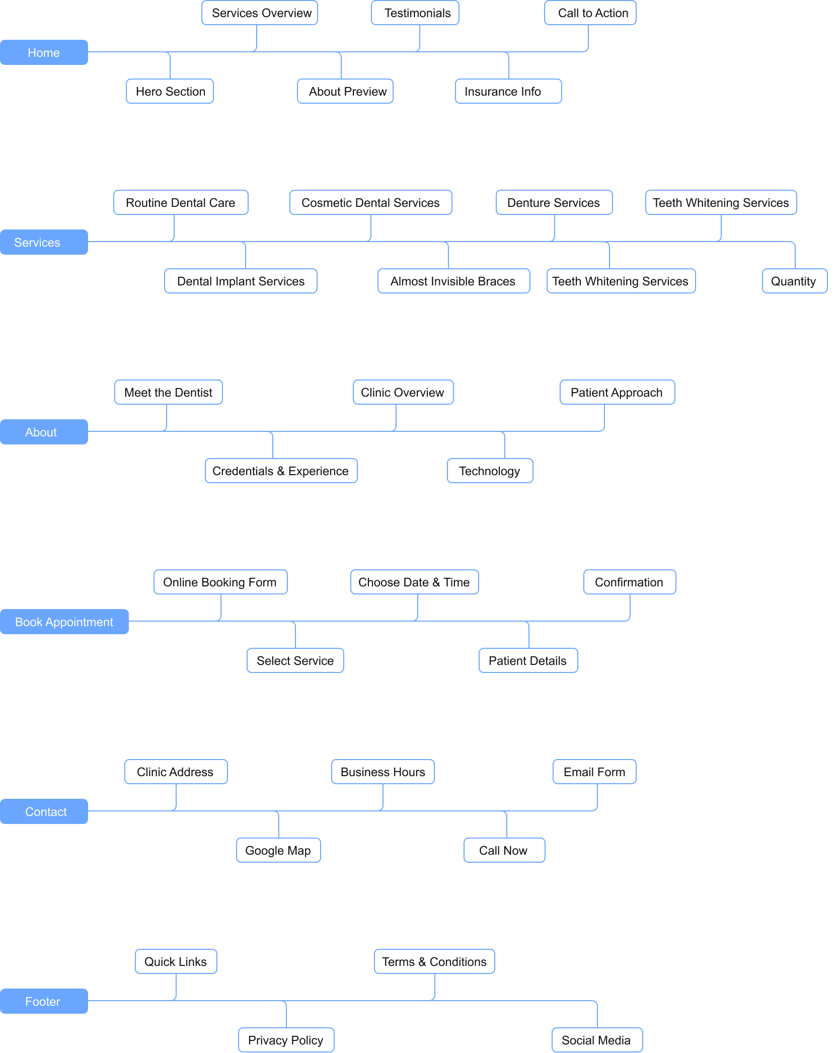 Information Architecture (IA) defines the structural framework of the website by organizing content into clear categories and logical hierarchies. For Care For You Dental, the IA was designed to simplify navigation, improve content discoverability, and guide patients seamlessly from exploring services to booking an appointment.