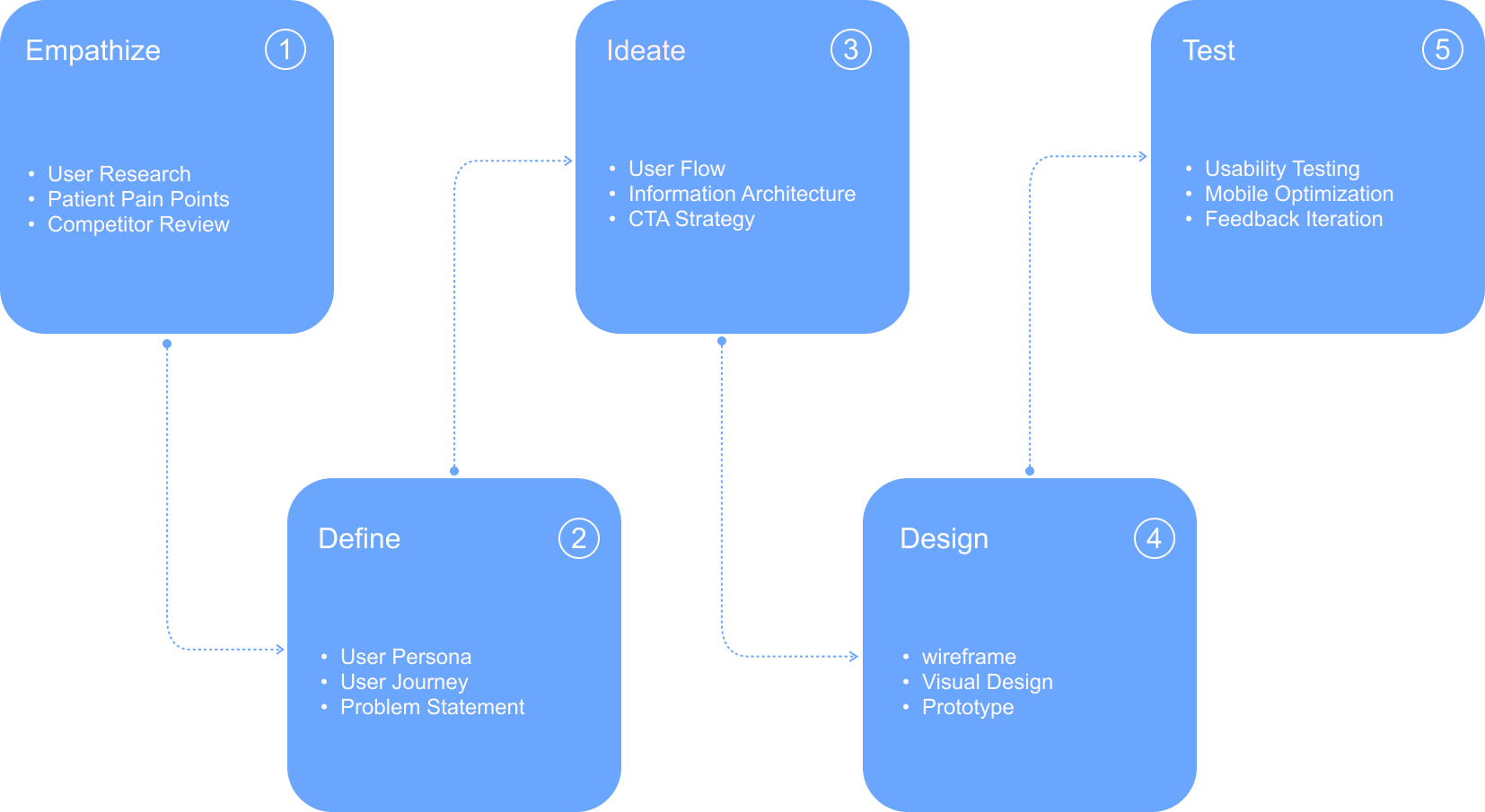 I followed a structured, user-centered design approach to ensure the final solution aligned with patient needs and business goals. Using an iterative and non-linear design thinking methodology, the process was divided into five key phases: Empathize, Define, Ideate, Design, and Test. Each phase focused on understanding user behavior, improving usability, and optimizing conversion.