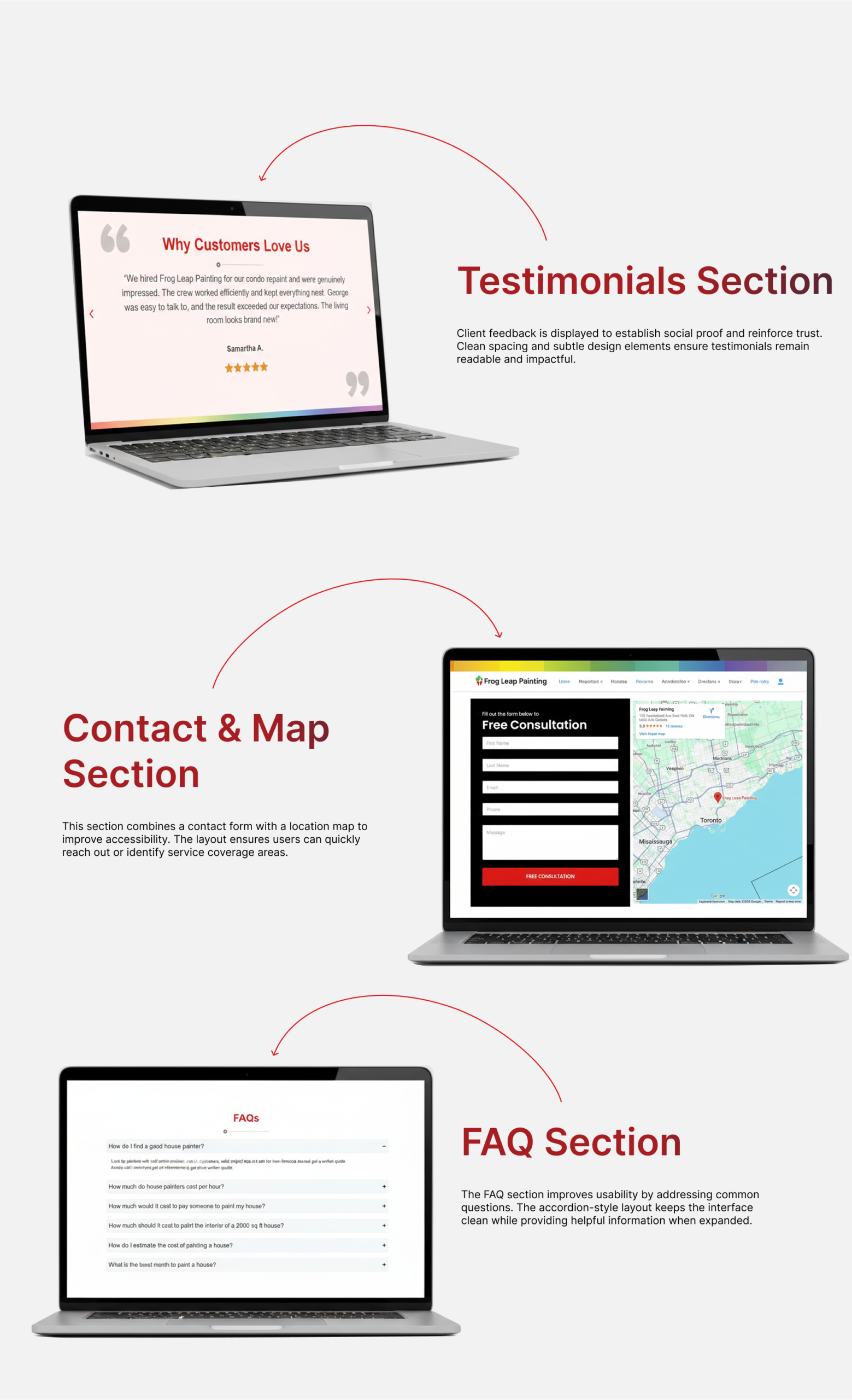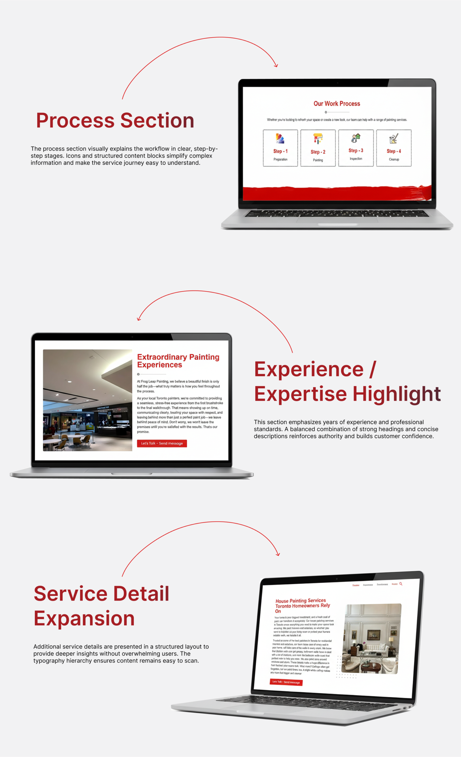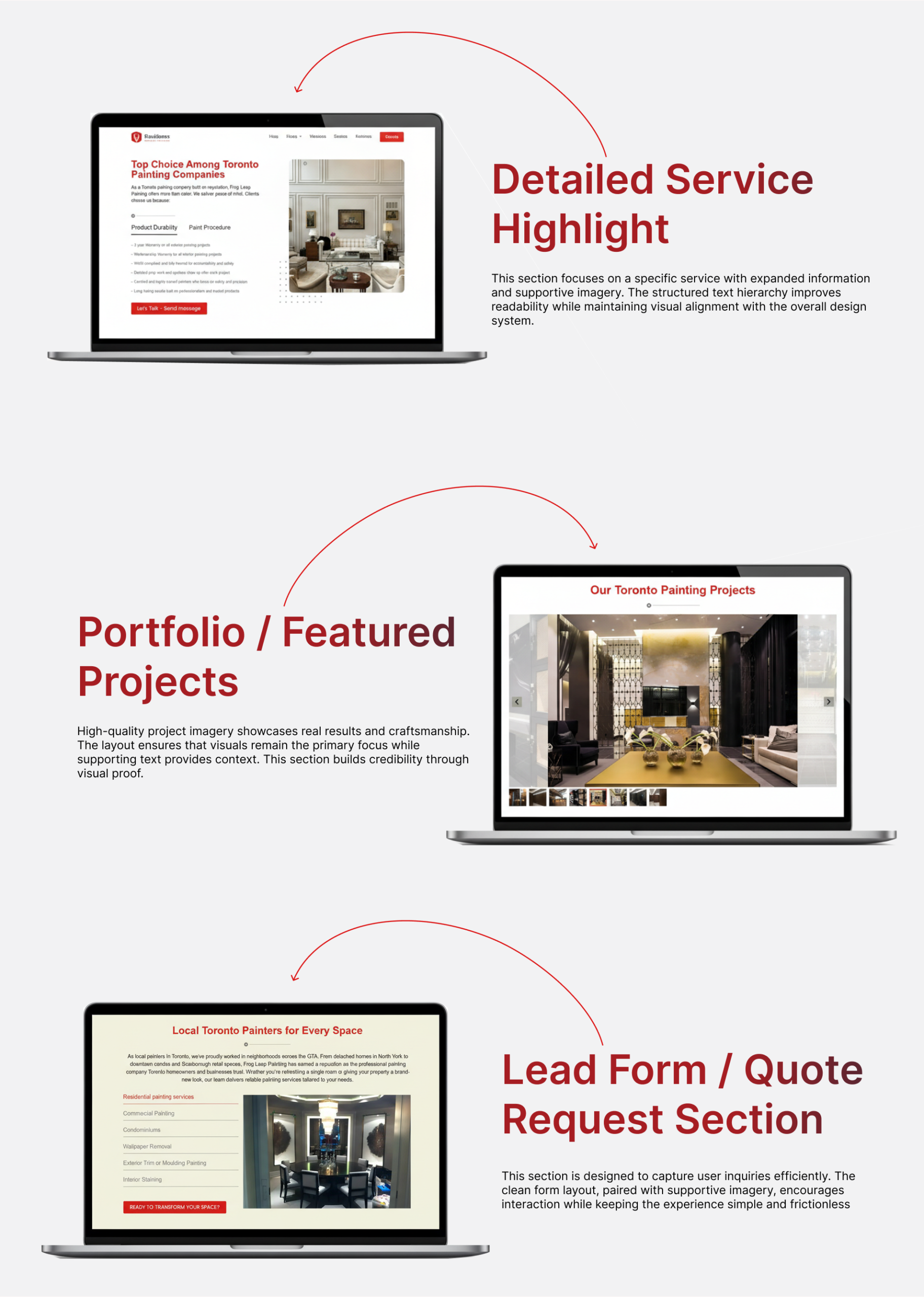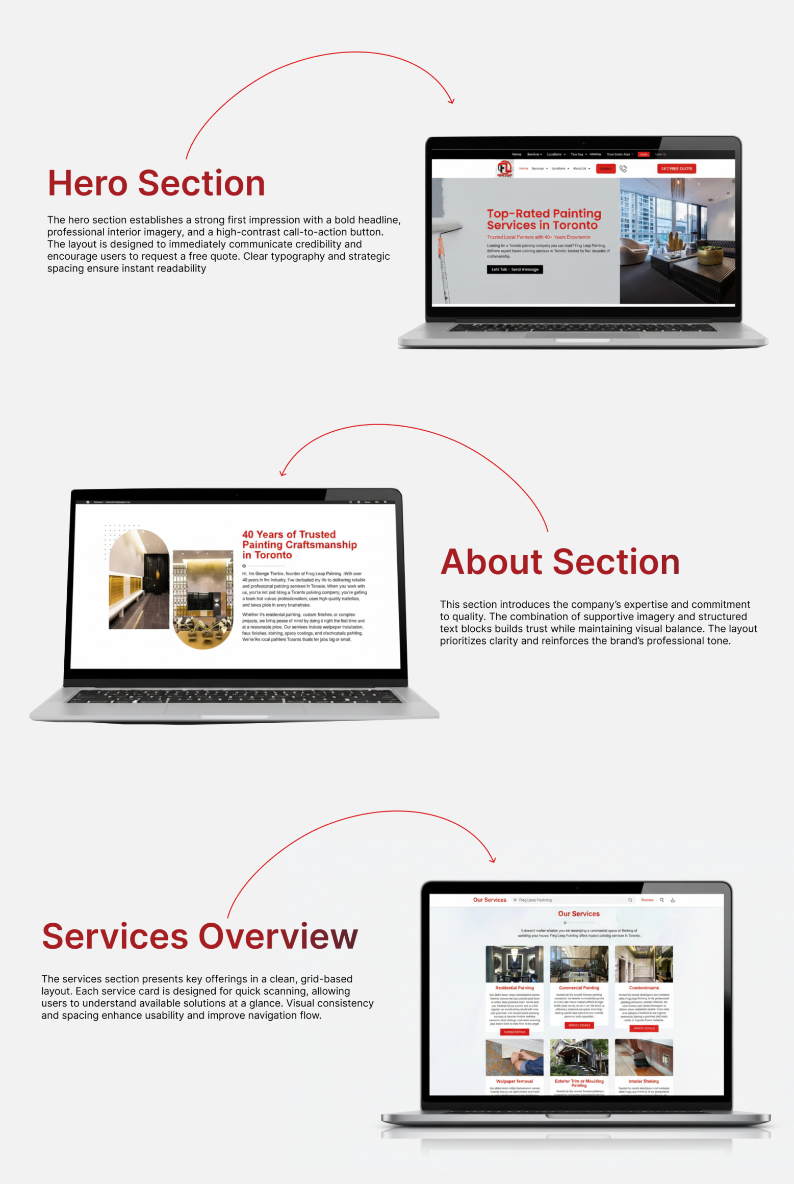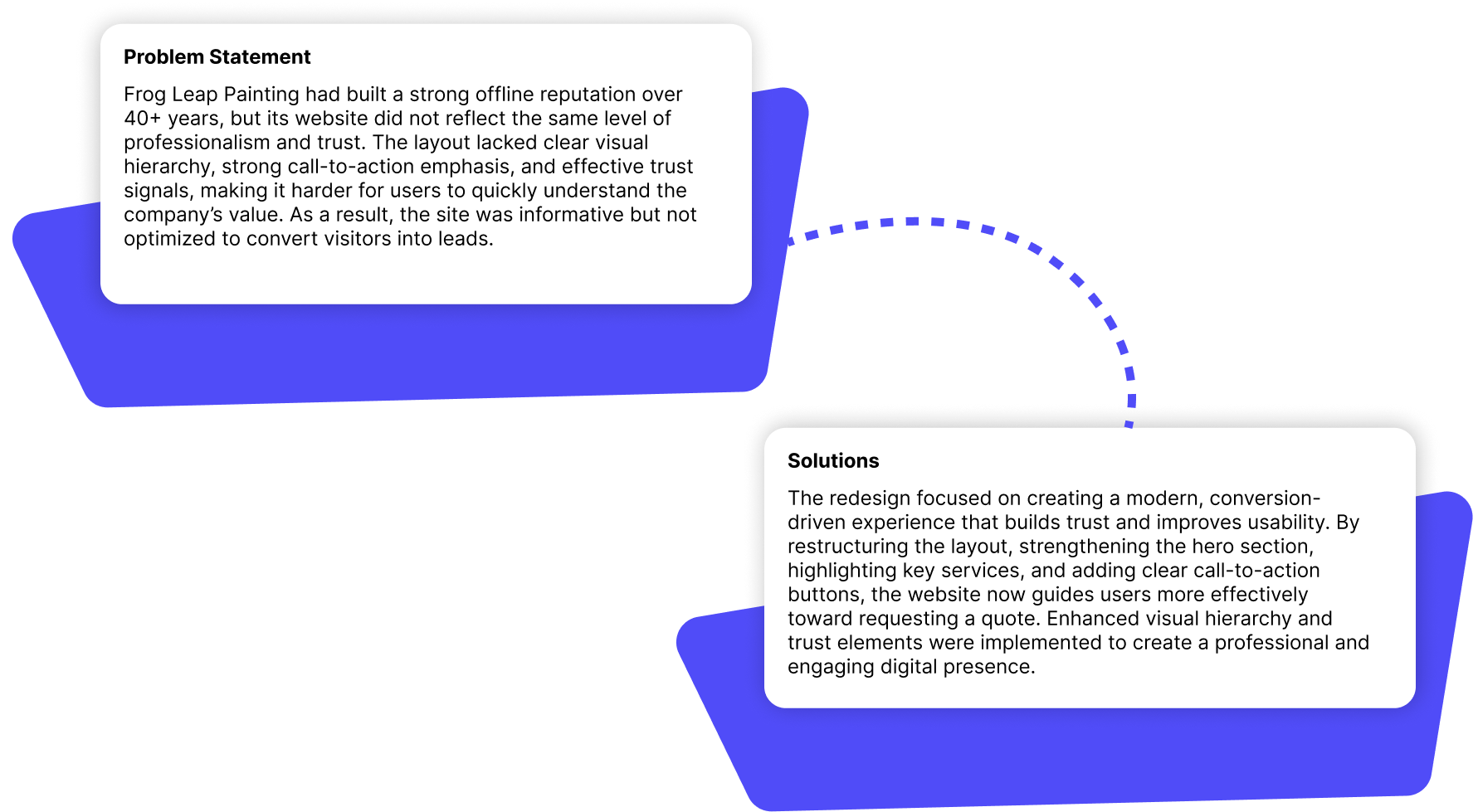 Frog Leap Painting had built a strong offline reputation over 40+ years, but its website did not reflect the same level of professionalism and trust. The layout lacked clear visual hierarchy, strong call-to-action emphasis, and effective trust signals, making it harder for users to quickly understand the company’s value. As a result, the site was informative but not optimized to convert visitors into leads.